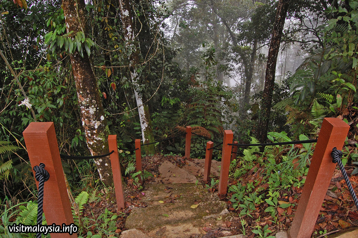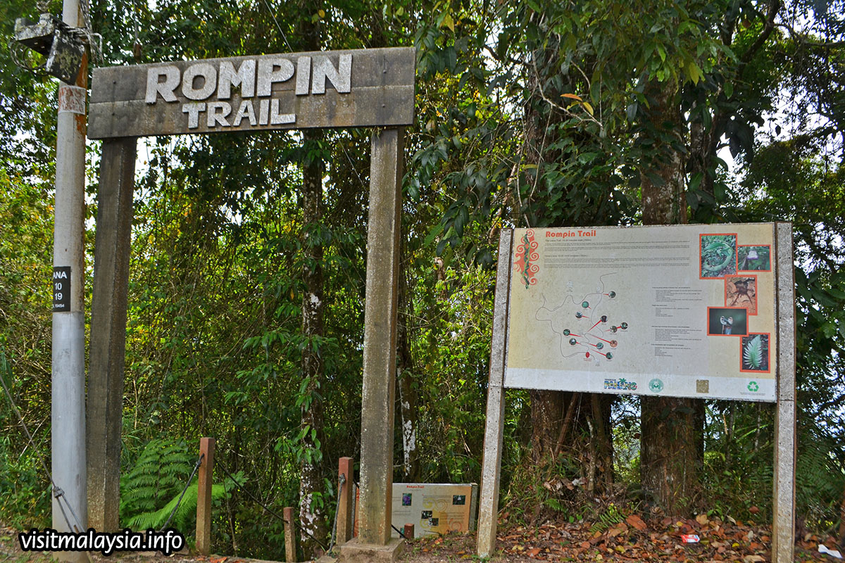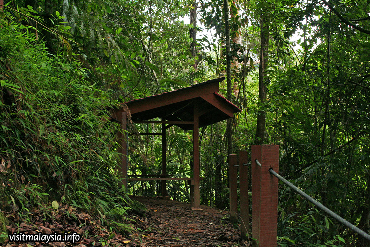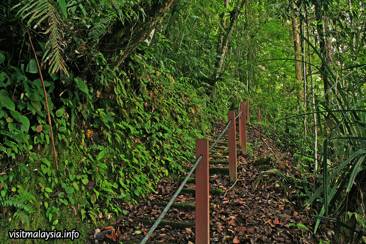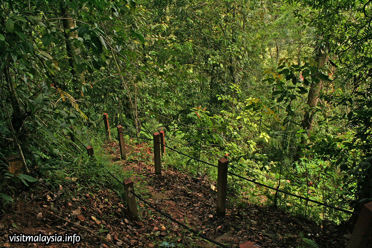 Rompin Trail is a short 500 meter trek along a steep path. Depending on which direction visitors approach, it is either a sharp climb or descend through a forest nestled on a slope. Wooden railings, ropes and railings provide some assistance in navigating the steep terrain. Rompin Trail was cleared in the late 1980s by residents of Taman Sungai Hijau Flats to enable quick and easy access to town.